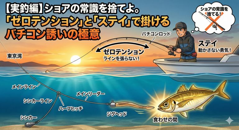 ショアの常識「ラインを張る」はNG?バチコンアジングで釣果を分ける「ゼロテンション」と「ステイ」の極意を徹底解説。ワームを自然に漂わせ、警戒心の強い東京湾の黄金アジに口を使わせるための実釣テクニックです。 -