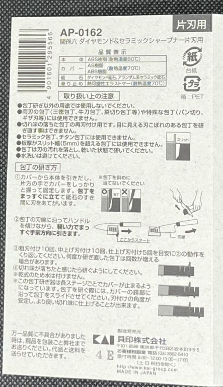 貝印 関孫六 ダイヤモンドセラミックシャープナー 片刃用 日本製 AP0162