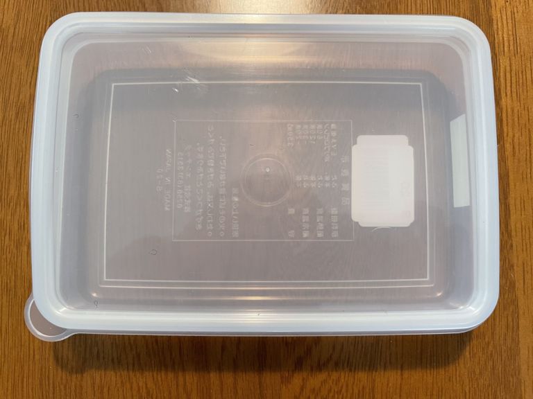 近くにダイソーがあるなら「薄型保存容器(260mL、2個)」(14.5cm × 11cm × 2.7cm)が丁度良いサイズだと思います。