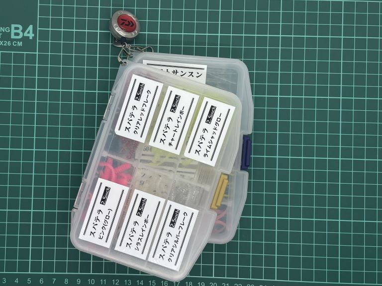 2.5インチ以下のワームはSFC ワームケース(黄色)やSFC フライケース(緑色)、3.2インチ以下のワームはSFCルアーケース(青色)に収納して使い分けると便利です。仕分けしないならマルチケースがおススメです。