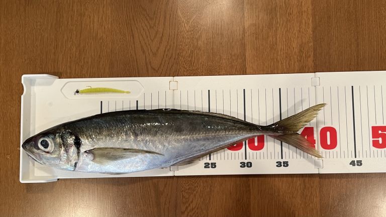 残り1時間で数を増やしたかったのでアクションを入れて釣れたのが20cmくらいのマアジです。