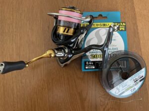 PEラインはサンライン PE-HG 0.4号を巻いていました。ラインの太さはOKなのですが、船用はマーク入りが便利なのでラインを新たに購入することにしました。2つあるスプールのうちどちらかを新規購入したラインに巻き替える必要があります。
